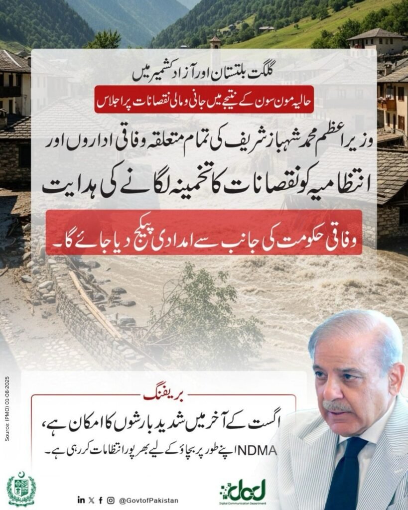 "حالیہ شدید مون سون سیزن کے تناظر میں ملک بھر اور خصوصا آزاد کشمیر اور گلگت بلتستان میں جانی و مالی نقصانات کے افسوس ناک واقعات ہوئے۔ متاثرہ علاقوں اور عوام سے اظہار یکجہتی کے لیے جلد گلگت بلتستان کا دورہ کروں گا۔ ذرائع مواصلات اور سڑکوں کی بحالی اور تعمیر و مرمت پر مقامی اور متعلقہ وفاقی ادارے خصوصی توجہ دیں۔ متعلقہ ادارے اور انتظامیہ نقصانات کا تخمینہ لگائیں۔”