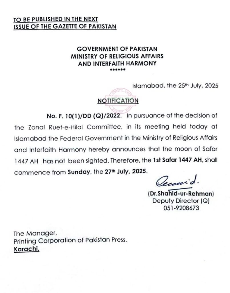 🛑 ملک میں صفر المظفر کا چاند نظر نہیں آیا۔کل 30 محرم الحرام 1447 ھ ہے۔یکم صفر المظفر اتوار 27 جولائی کو ہو گاچیئرمین رویت ہلال کمیٹی مولانا محمد عبدالخبیر آزاد کے اعلان کے مطابق نوٹیفیکیشن جاری